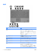 名称 説明 消灯:コンピュータが外部電源に接続されている場合は、コンピ ュータのすべてのバッテリが完全に充電されるとバッテリ ランプ が消灯します。コンピュータが外部電源に接続されていない場合 は、ローバッテリ状態になるまでランプが消灯したままになりま す (7) ドライブ ランプ ● 点滅:ハードドライブまたはオプティカル ドライブにアク セスしています ● オレンジ色に点灯: HP モバイル データ プロテクション 3D によって内蔵ハードドライブが一時停止しています *電源ランプは 2 つあり、両方とも同じ情報を通知します。電源ボタンのところにある電源ランプはコンピュータを開いてい るときにのみ見えます。もう一方の電源ランプは、コンピュータ前面の常に見える場所にあります。 †無線ランプは 2 つあり、両方とも同じ情報を通知します。無線ボタンのところにある無線ランプはコンピュータを開いて いるときにのみ見えます。もう一方の無線ランプは、コンピュータ前面の常に見える場所にあります。 JAWW 表面の各部 5