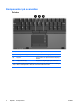 Styrplatta Komponent Beskrivning (1) Styrplatta* Flyttar pekaren och väljer eller aktiverar objekt på skärmen. Kan konfigureras för användning av andra musfunktioner, t ex rullning, markering och dubbelklickande. (2) Vänster knapp på styrplattan* Fungerar som vänsterknappen på en extern mus. (3) Styrplattans rullningsområde För rullning uppåt och nedåt. (4) Höger knapp på styrplattan* Fungerar som högerknappen på en extern mus. *I den här tabellen beskrivs fabriksinställningarna.