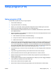 Setup-program (F10) Setup-program (F10) Använd setup-programmet (F10) för att göra följande: SVWW ● Ändra fabriksinställningar. ● Ange systemets datum och klockslag. ● Ställa in, visa, ändra eller verifiera systemets konfiguration såsom inställningar för processor, grafik, minne, ljud, lagring, kommunikation och inmatningsenheter. ● Ändra startordningen mellan startbara enheter som hårddiskar, diskettenheter, optiska enheter eller USB-flashenheter.