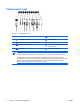 Näppäimistö Taulukko 1-4 Näppäimistön osat 1 FIWW 1 Toimintonäppäimet Toimintonäppäimien avulla voidaan suorittaa erityistoimintoja käytetystä sovelluksesta riippuen. 2 Muokkausnäppäimet Muokkausnäppäimiä ovat seuraavat: Insert, Home, Page Up, Delete, End ja Page Down. 3 Tilan merkkivalot Tilan merkkivalot ilmaisevat tietokoneen tilan ja näppäimistöasetukset (Num Lock, Caps Lock ja Scroll Lock). 4 Numeronäppäimet Numeronäppäimet toimivat laskimen näppäimistön tapaan.