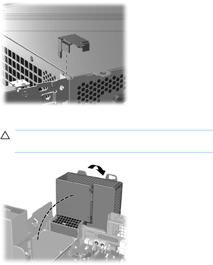 9. หมุนโครงของแหลงจายไฟใหตั้งตรง ฮารดไดรฟจะตั้งอยูที่ขางใตโครงของแหลงจายไฟ