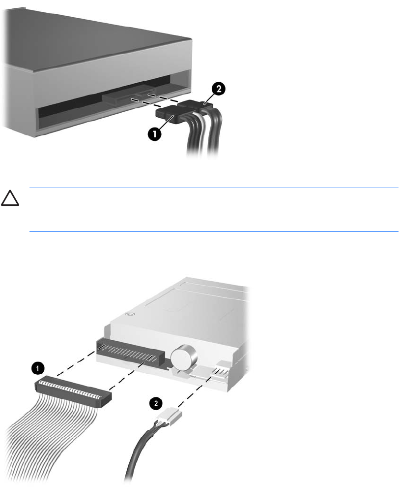 b. Se si installa un'unità a dischetti, collegare il cavo dati (1) e il cavo di alimentazione (2) alla