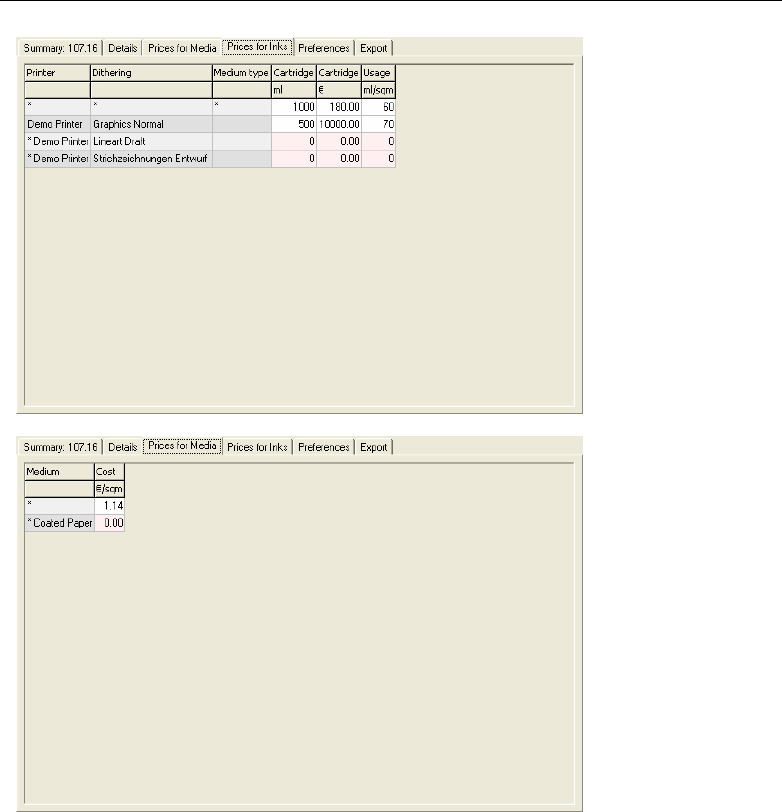 Prices for Consumables (Tab Prices for Media & Tab Prices for Inks)