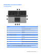 Onderdelen aan de voorkant Onderdeel Beschrijving (1) ● Turkoois: een geïntegreerd apparaat voor draadloze communicatie, zoals een draadloos-netwerkadapter, de HP module voor draadloos breedband en/of een Bluetoothapparaat, is ingeschakeld. ● Oranje: alle apparaten voor draadloze communicatie zijn uitgeschakeld. ● Aan: de computer is ingeschakeld. ● Knipperend: de computer staat in de slaapstand. ● Uit: de computer is uitgeschakeld of staat in de hibernationstand.