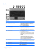 Komponente s desne strane Komponenta Opis (1) Utičnica za audioizlaz (slušalice) su u nju priključeni dodatni stereozvučnici s napajanjem, slušalice, male slušalice, naglavne slušalice ili TV zvuk. (2) Utičnica za audioulaz (mikrofon) U nju se priključuju dodatni mikrofon za naglavne slušalice računala, stereo mikrofon ili monofoni mikrofon. (3) USB priključci (2) (samo odabrani modeli) Služe za priključivanje dodatnih USB uređaja.