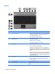 Komponenter på framsidan Komponent Beskrivning (1) ● Turkos: En inbyggd trådlös enhet, t.ex. en enhet för trådlöst lokalt nätverk (WLAN), HP:s mobila bredbandsmodul och/ eller en Bluetooth-enhet, är på. ● Gul: Alla trådlösa enheter är avstängda. ● Tänd: Datorn är påslagen. ● Blinkande: Datorn är i sömnläge. ● Släckt: Datorn är avstängd eller i vänteläge. ● Gulbrun: Ett batteri laddas. ● Blinkande turkos: Ett batteri är nästan fulladdat.