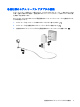 各国仕様のモデム ケーブル アダプタの接続 モジュラ コンセントは国によって異なります。モデムおよびモデム ケーブル(一部のモデルにのみ 付属)を国外で使用する場合は、各国仕様のモデム ケーブル アダプタ(一部のモデルにのみ付属) を用意する必要があります。 RJ-11 モデム コネクタ以外のアナログ電話回線用モジュラ コンセントにケーブルを接続するには、 以下の操作を行います。 1. モデム ケーブルをコンピュータ本体のモデム コネクタに差し込みます(1) 。 2. モデム ケーブルを各国仕様のモデム ケーブル アダプタに接続します(2) 。 3.