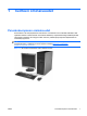 Minitornin muuttaminen pöytäkokoonpanoksi 1. Poista kaikki turvalaitteet, jotka estävät tietokoneen avaamisen. 2. Poista tietokoneesta kaikki irrotettavat tietovälineet, esimerkiksi levykkeet ja CD-levyt. 3. Sammuta tietokone oikein käyttöjärjestelmän kautta ja sammuta sitten kaikki ulkoiset laitteet. 4. Irrota virtajohto pistorasiasta ja ulkoiset laitteet tietokoneesta.