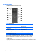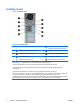 Billentyűzet 1-5 ábra A billentyűzet részei 1-4 táblázat A billentyűzet részei 1 HUWW 1 Funkcióbillentyűk A használt alkalmazástól függően speciális feladatokat hajtanak végre. 2 Szerkesztő billentyűk A következő billentyűkből áll: Insert (Beszúrás), Home (Elejére), Page Up (Lapozás vissza), Delete (Törlés), End (Végére) és Page Down (Lapozás előre). 3 Állapotjelző LED-ek A számítógép és a billentyűzet beállításainak állapotát jelzik (Num Lock, Caps Lock és Scroll Lock).