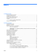 Saturs 1 Izstrādājuma iespējas Standarta konfigurācijas līdzekļi ........................................................................................................... 1 Priekšējā paneļa komponenti ............................................................................................................... 2 Multivides karšu lasītāja komponenti .................................................................................................... 3 Aizmugurējā paneļa komponenti ........................