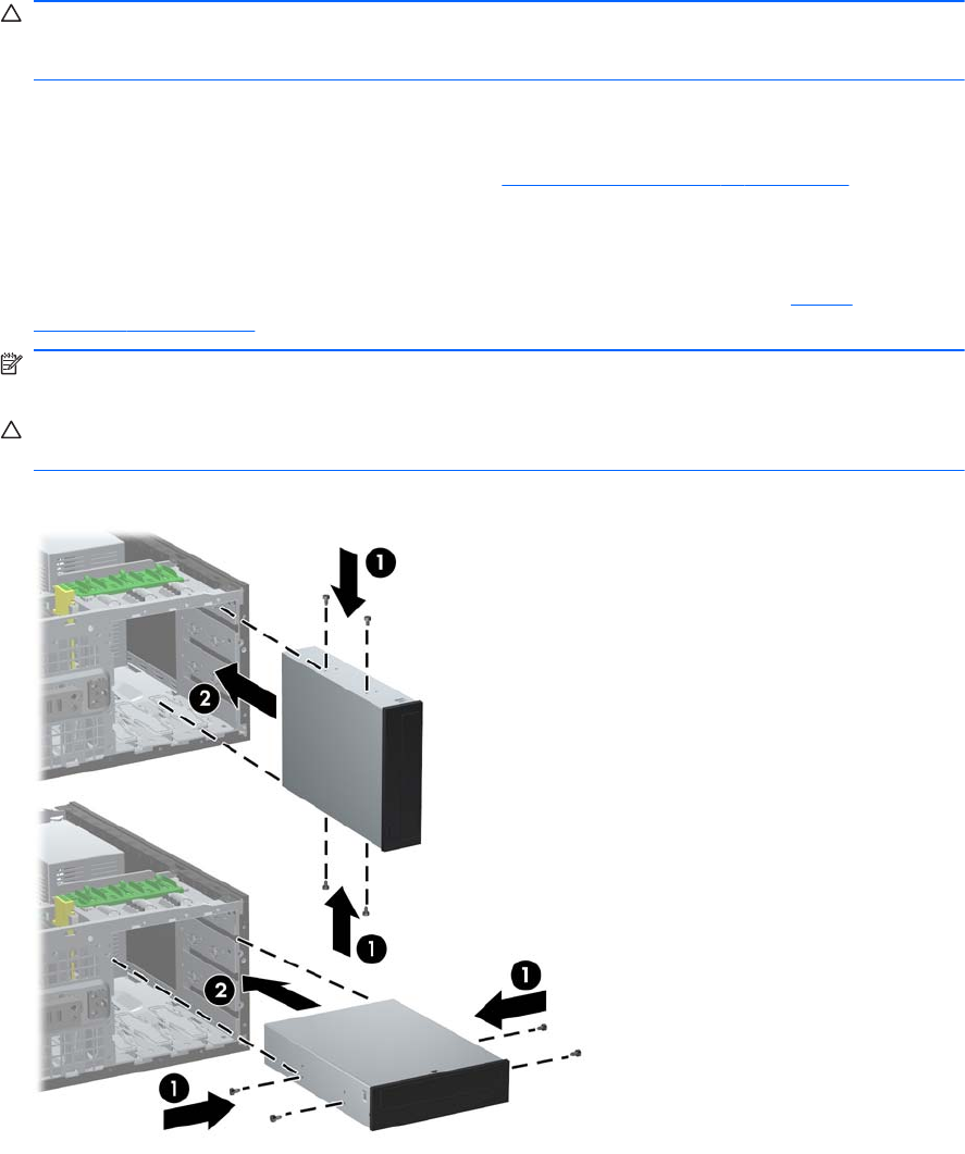 2-22 Iliustracija 5,25 colių diskų įrenginio įdėjimas į Minitower (viršus) ir darbastalį (apačia)