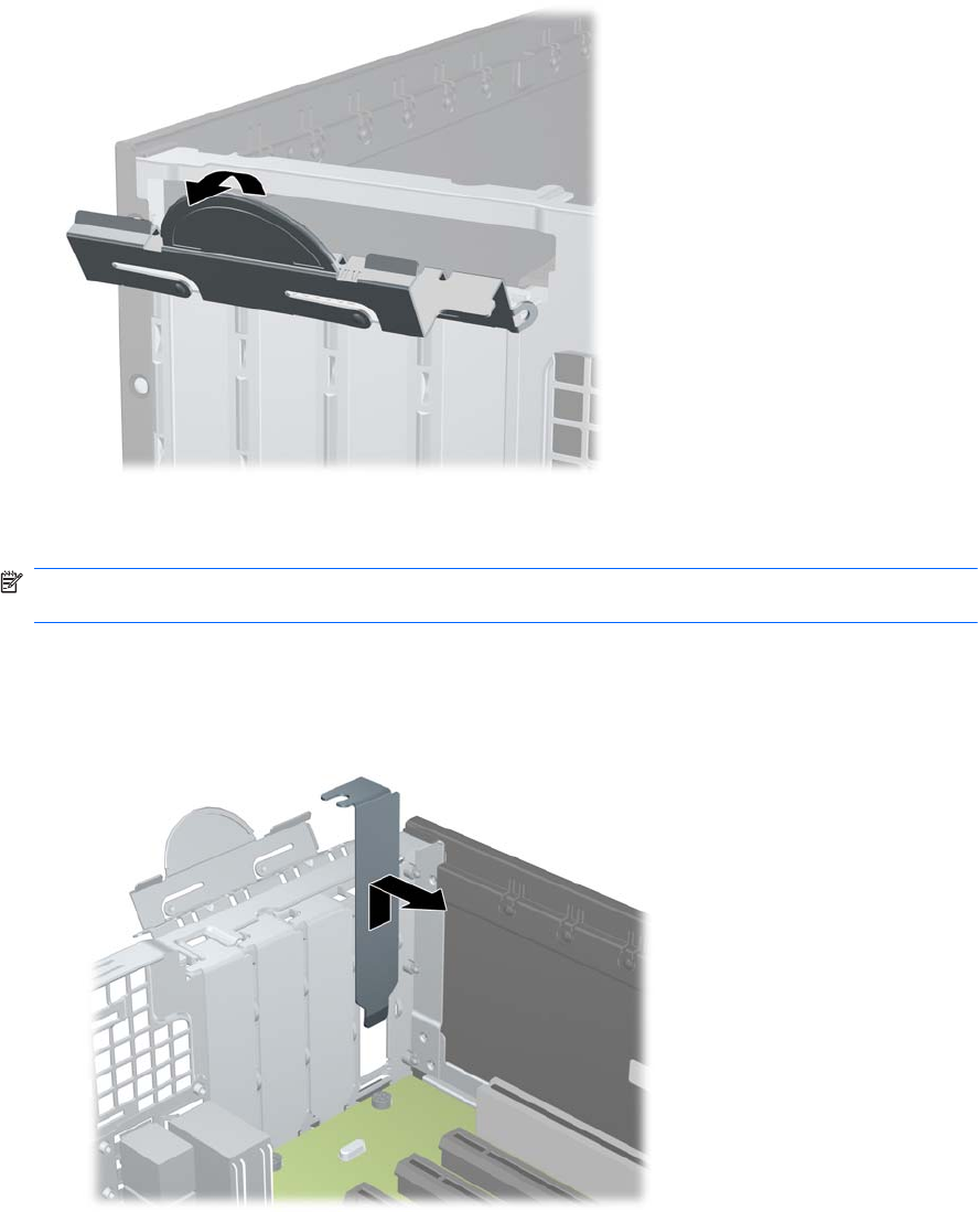 8. Освободите защелку, которая удерживает заглушку гнезда PCI, подняв зеленый язычок