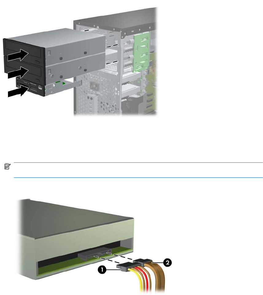 a. Dacă instalaţi o unitate optică, conectaţi cablul de alimentare (1) şi cablul de date (2) în