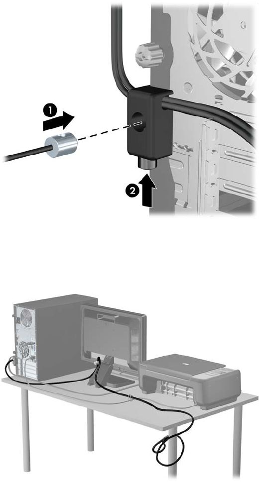 7. Introduceţi capătul cablului de siguranţă în dispozitivul de blocare (1) şi împingeţi înăuntru