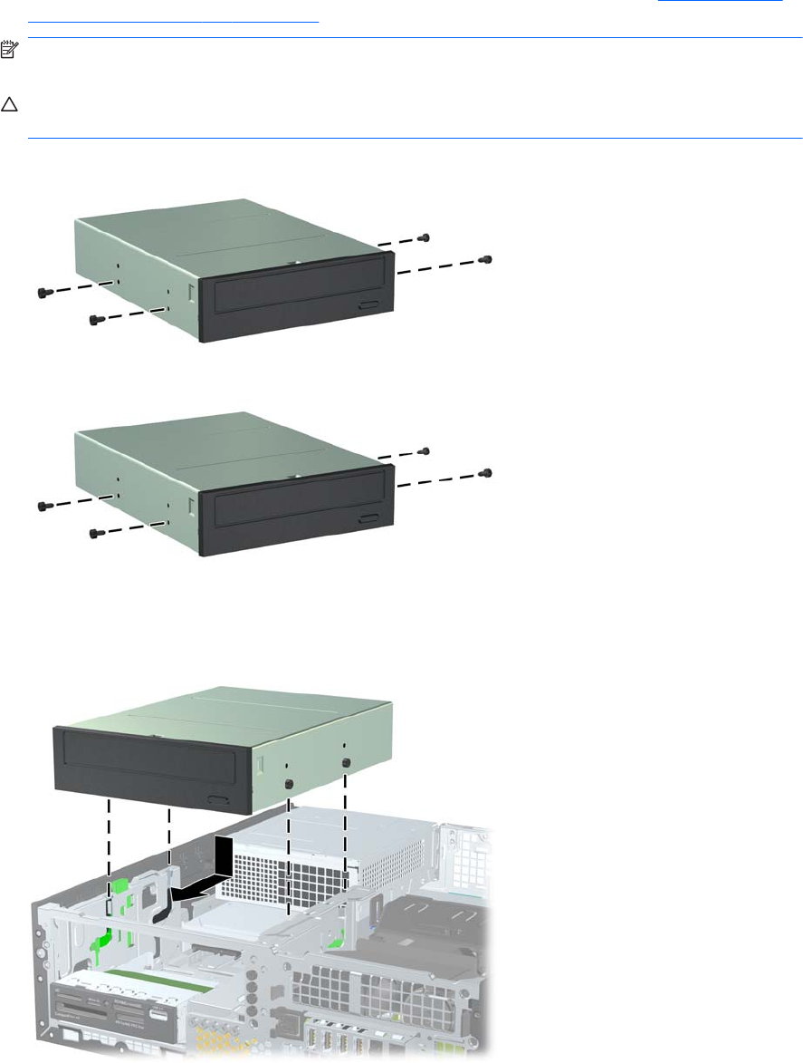 4-23 Iliustracija Prisukamųjų varžtų įsukimas į optinių diskų įrenginį (2 iš 2)