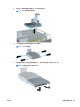 8. 按住硬盘驱动器托架左侧的释放锁定器 (1),然后将托架手柄旋转到右边 (2)。