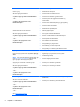 - kontakt, forankrings- 15 kontakt, strøm- 12 kontakter lydinngang (mikrofon) 11 lydutgang (hodetelefoner) 11 nettverks- 14 RJ-11 (modem) 14 RJ-45 (nettverk) 14 L lamper av/på- 5, 10 batteri- 10 Caps Lock- 5 dempe- 6 harddisk- 10 HP QuickWeb- 6 Num Lock- 6 styrepute- 5 trådløs- 5, 10 webkamera- 13 luftespalter, plassering 11, 15 lydinngang (mikrofonkontakt) 11 lydutgang (hodetelefonkontakt) 11 M mediekortleser, plassering 12 Microsofts ekthetsgarantietikett 57 minnemodul bytte 42 sette inn 43 ta ut 43 minnemo