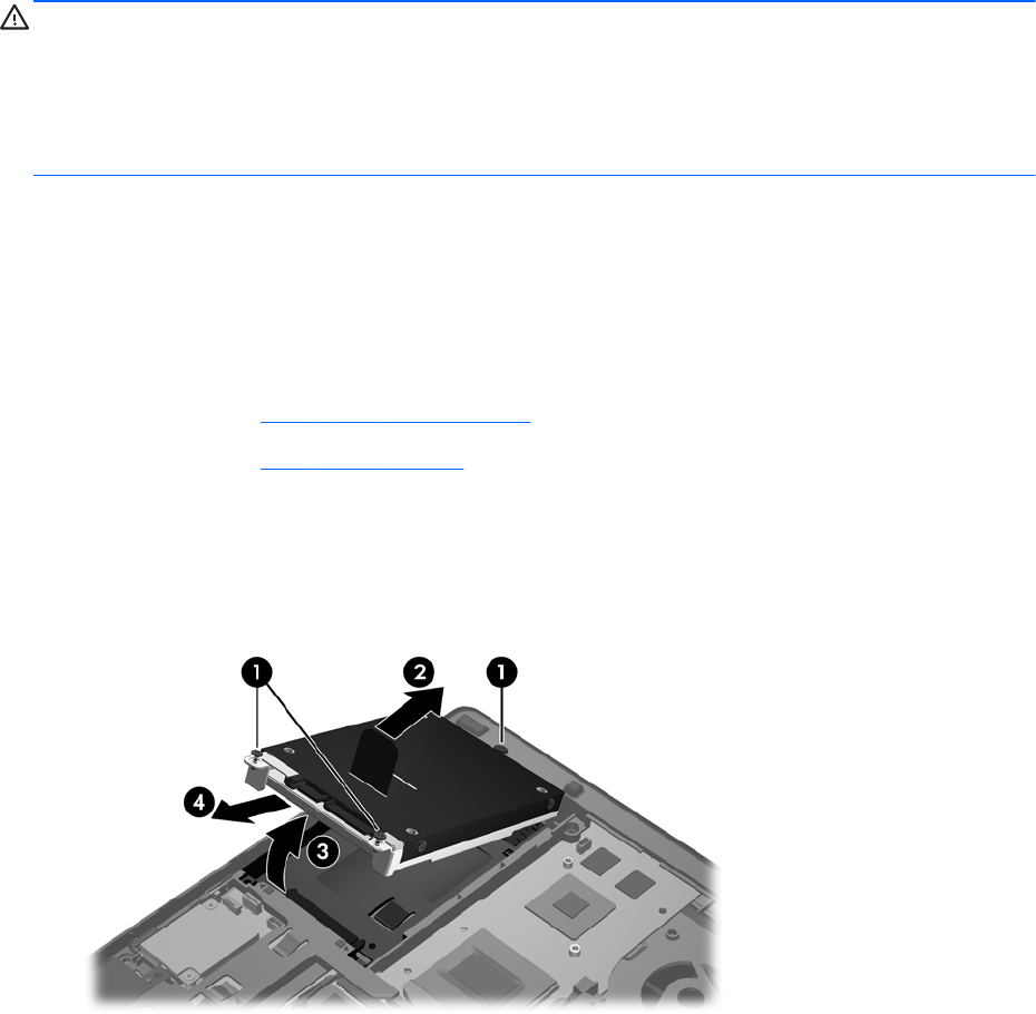 7. 使用塑料卡舌将硬盘驱动器侧提起一个角度 (3),然后从笔记本计算机中取出硬盘驱动器 (4)。