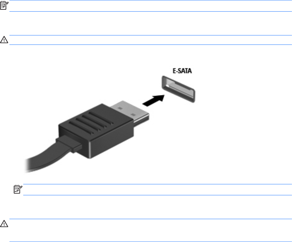 要将 eSATA 设备连接到笔记本计算机,请将该设备的 eSATA 电缆与 eSATA 端口相连。