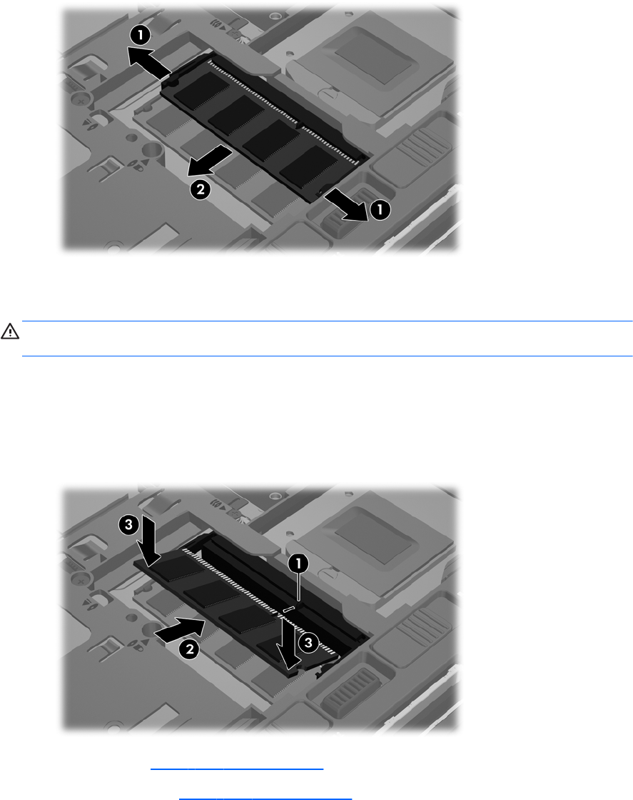 b. 使内存模块与内存模块盒表面成 45 度角,将内存模块 (2) 按入内存模块插槽中,直至卡入
