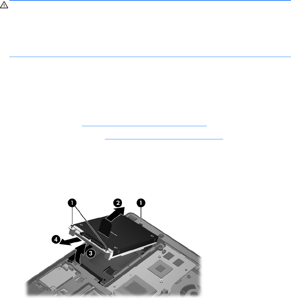7. Za pomocą plastikowego uchwytu odchyl dysk twardy (3) i wyjmij go (4) z komputera.