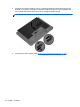 4. Pagrieziet akumulatora nodalījumu pret sevi, pabīdiet apakšējā vāka atbrīvošanas fiksatoru pa
