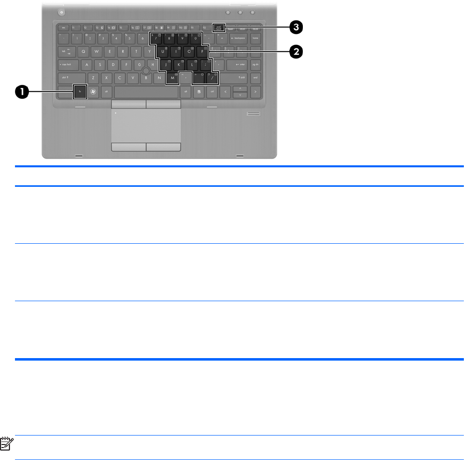 (1) Klavišas fn Kai paspaudžiamas kartu su klavišu num lk, įjungia arba išjungia