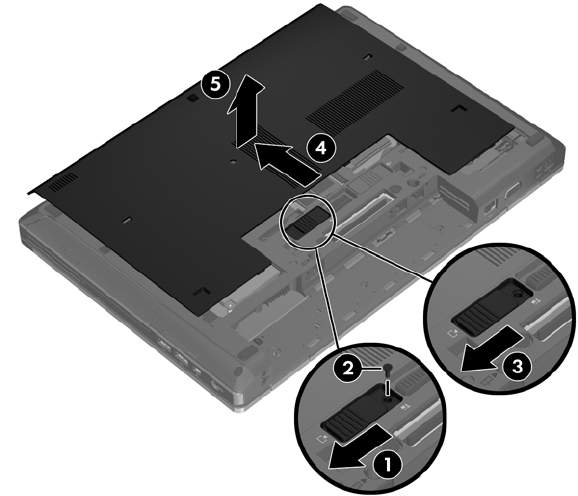 3. Pastumkite apatinį dangtelį kompiuterio priekio link (4) ir keldami (5) nuimkite.