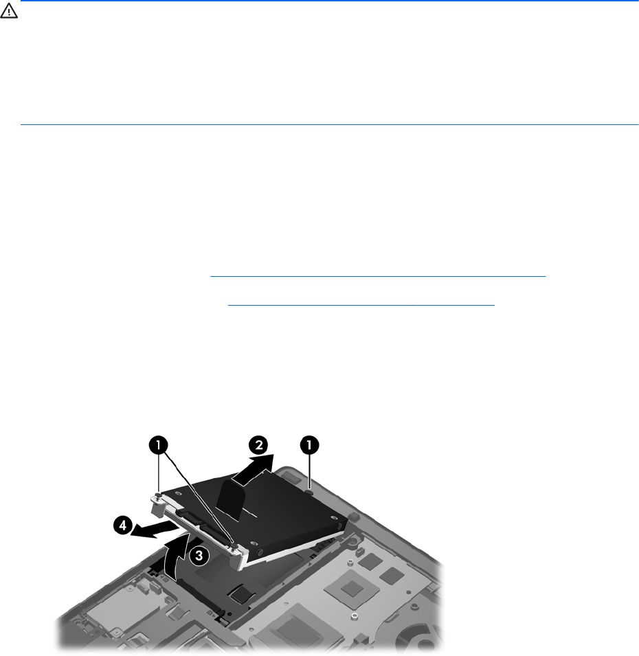 7. Plastikiniu fiksatoriumi pakelkite standųjį diską kampu (3) ir išimkite jį (4) iš kompiuterio.