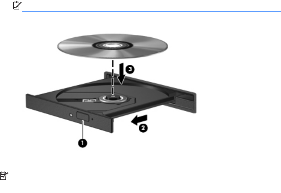 2. Kad atlaisvintumėte diskų įrenginio dėklą, paspauskite atidarymo mygtuką (1) ant diskų įrenginio