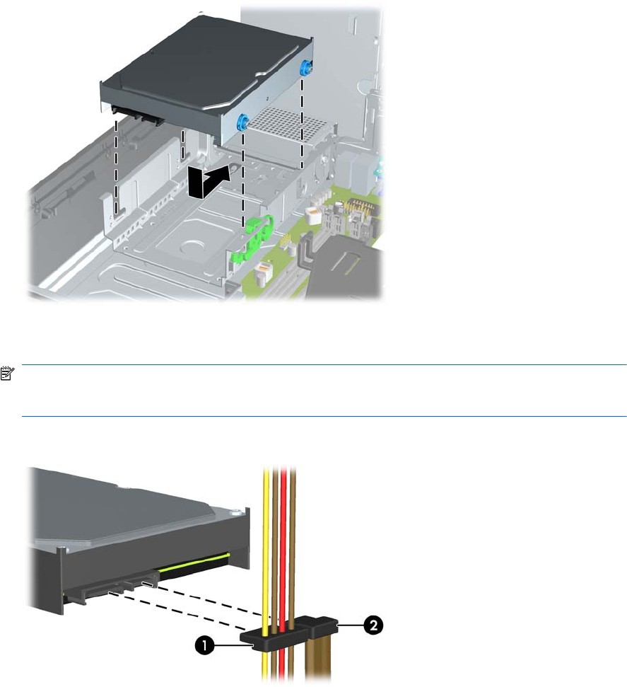 13. Įjunkite maitinimo (1) ir duomenų perdavimo (2) kabelius į jungtis, esančias standžiojo disko