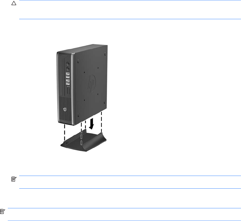 5. Paverskite kompiuterį taip, kad jo kairioji pusė atsidurtų apačioje ir tvirtai įstatykite jį į stovą.