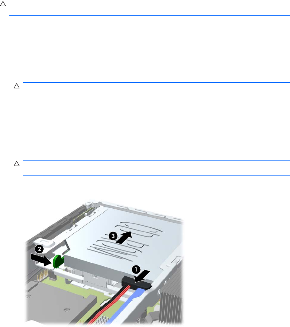 ĮSPĖJIMAS: visos laikmenos turi būti išimtos iš diskų įrenginio prieš išimant diskų įrenginį iš