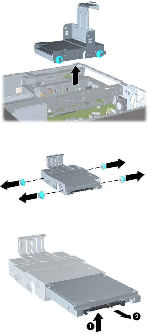 11. Pakelkite standųjį diską į įtvirtinimo viršų (1) ir ištraukite diską iš įtvirtinimo (2).