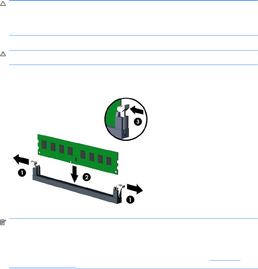 6. Atidarykite abu atminties modulio lizdo skląsčius (1), tada įstatykite atminties modulį į lizdą (2).