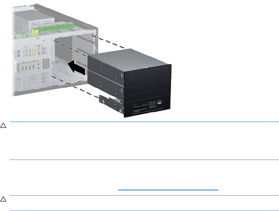 9. Švelniai stumkite diskų įrenginį į viršutinę laisvą nišą, kol užsifiksuos. Teisingai įstačius diskų