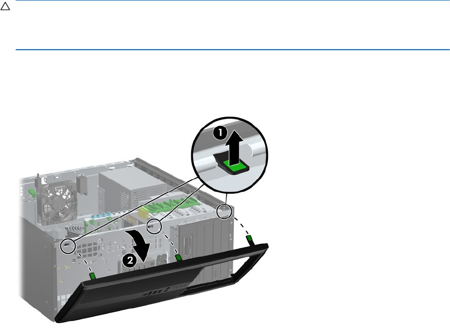 6. Поднимите три защелки панели (1), затем поверните панель для снятия с корпуса (2).