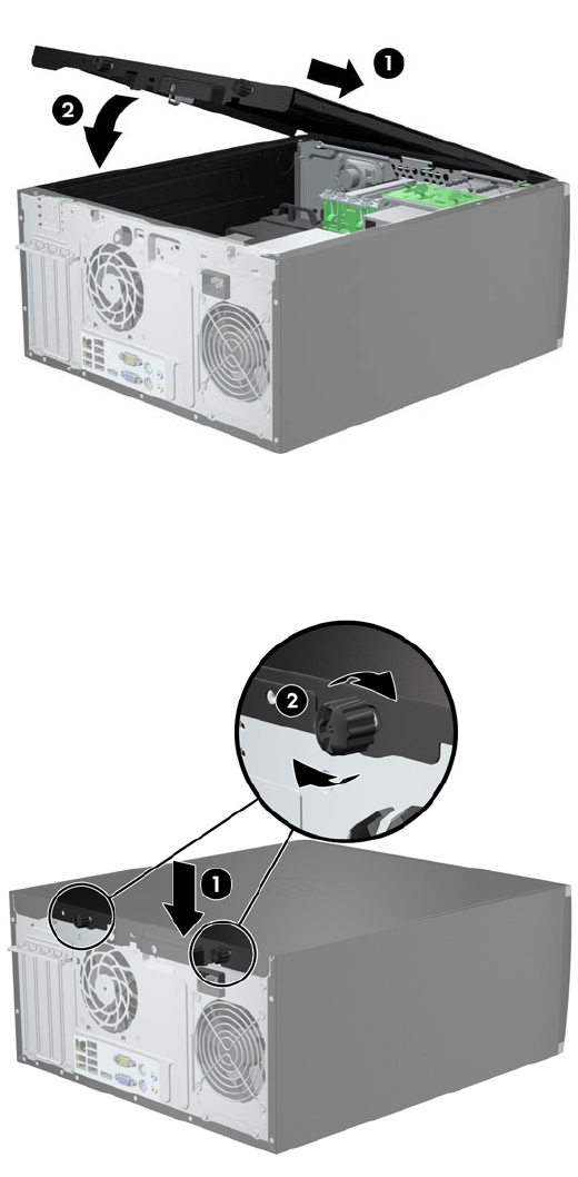 (1) apoi apăsaţi capătul din spate al panoului de acces pe unitate (2).