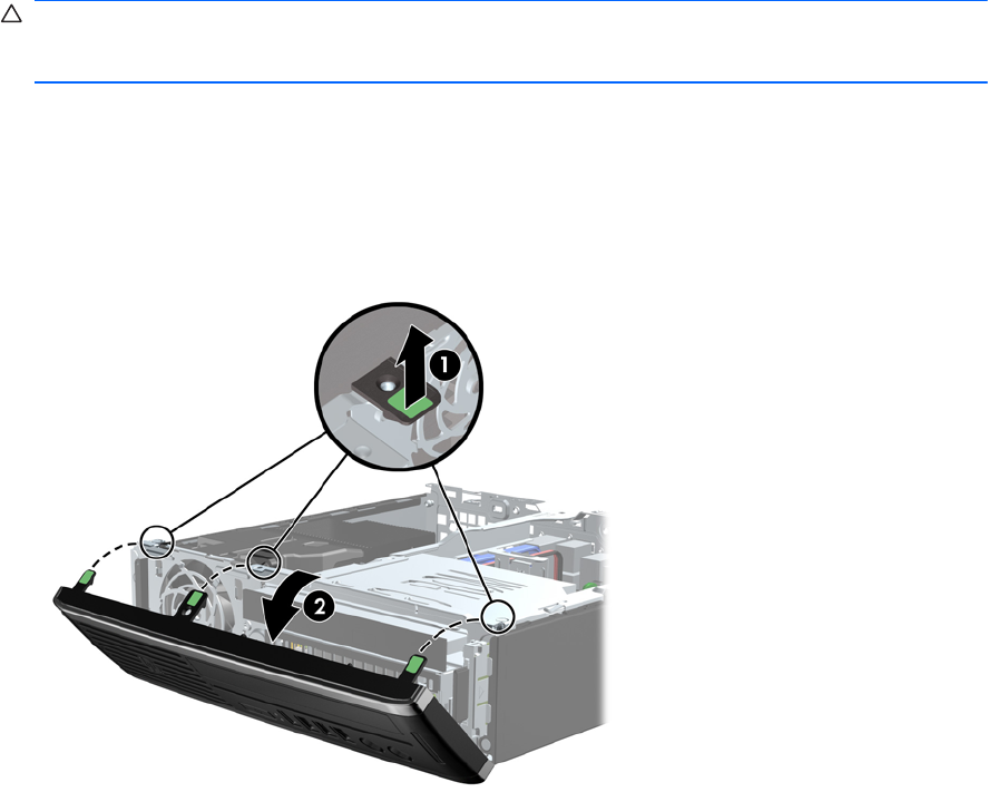 7. Atkelkite tris priekinio dangtelio (1) šone esančius fiksatorius, tada atlenkite dangtelį nuo korpuso