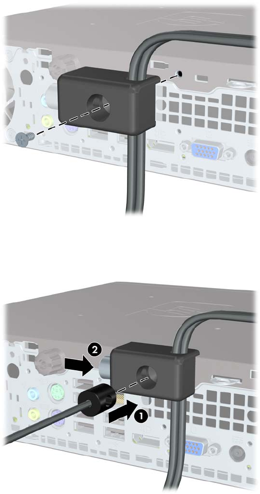 7. Įstatykite apsauginio troso kaištinį galą į užraktą (1) ir įspauskite mygtuką, (2) kad užrakintumėte