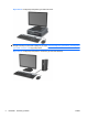 Rysunek 1-3 Konfiguracja komputera typu small form factor UWAGA: Komputer typu small form factor może też być używany w konfiguracji tower (wieża). Więcej informacji na ten temat znajduje się w części Zmiana konfiguracji typu desktop na konfigurację typu tower na stronie 102 tego podręcznika.