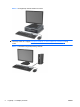 1 Značajke proizvoda Uobičajene značajke konfiguracije Značajke ovise o modelu. Za potpuni popis ugrađenog hardvera i softvera pokrenite dijagnostički uslužni program (dostupan samo na nekim modelima računala). Slika 1-1 Konfiguracija promjenjivog mini-kućišta NAPOMENA: HP Compaq s promjenjivim mini-kućištem može se lako promijeniti u stolno (vodoravno) kućište. Za više informacija pogledajte poglavlje Promjena iz Minitower u Desktop konfiguraciju na stranici 46 u ovom priručniku.