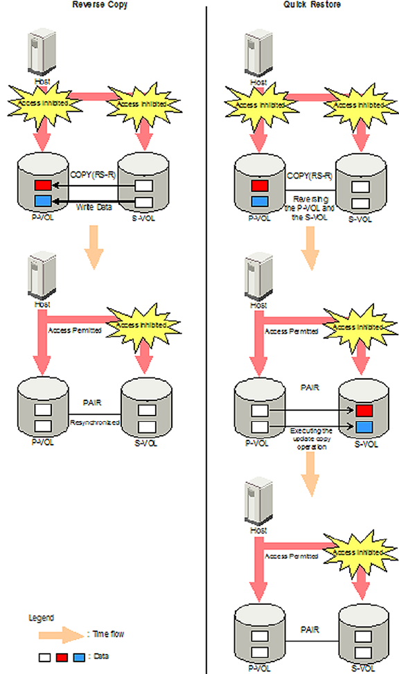 copies all differential data from the S-VOL to the T-VOL. When a reverse copy or quick restore