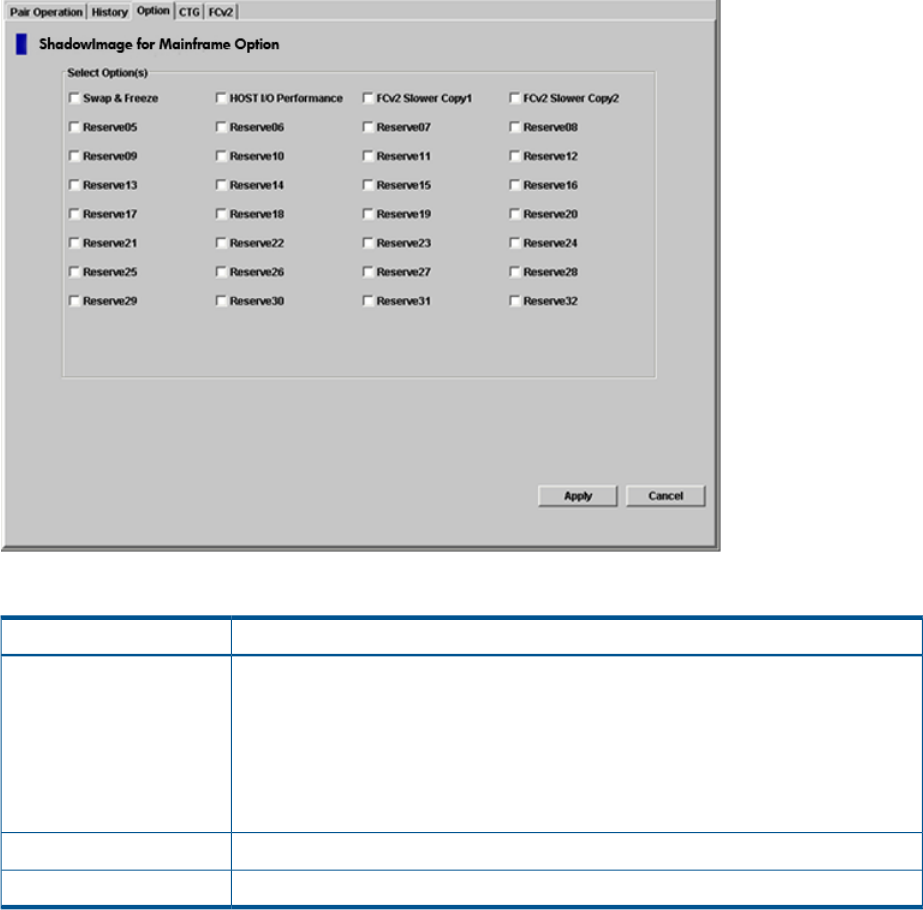 Applies the SIz options checked in the Select Option(s) box to the storage system.Apply button