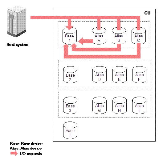 base device 1 by using Compatible PAV, I/O requests will be issued to the alias device A, B or C