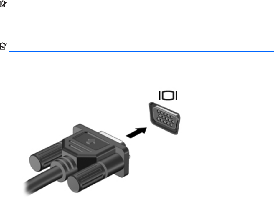 若要在外接式 VGA 顯示器上看到電腦螢幕影像或是投影進行簡報,請將顯示器或投影機連接到電腦的