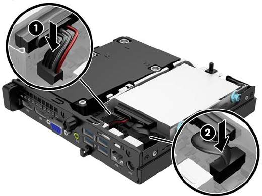 12. Під'єднайте кабель живлення жорсткого диска (1) та кабель даних (2) до системної плати.