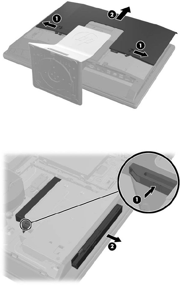 7. Mantenga oprimida la pestaña (1) en la parte posterior del gabinete de la unidad de disco óptico