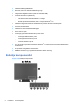 Tabel 1-1 Esikülje komponendid Komponent Komponent 1 Veebikaamera koos privaatsuskatikuga (valikuline) 7 Kõlari vaigistamine 2 Kahe mikrofoni ühenduspesad (valikuline) 8 Helitugevuse vähendamine 3 Veebikaamera talitluse LED-tuli (valikulise veebikaameraga) 9 Helitugevuse suurendamine 4 16:9 laiekraaniline LED-tagantvalgusega LCD-kuvar 10 Mikrofoni vaigistamine 5 Toite LED-tuli 11 Heleduse vähendamine 6 Kõrgjõudlusega stereokõlarid 12 Heleduse suurendamine Ikoonide süütamiseks puudu