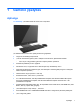 1 Gaminio ypatybės Apžvalga 1-1 Iliustracija „HP EliteOne 800 G1 All-in-One“ kompiuteris „HP EliteOne 800 G1 All-in-One“ pasižymi tokiomis ypatybėmis: ● Integruoti visi reikalingi komponentai ● „Full HD“ skiriamosios gebos (1920 x 1080) IPS LCD ekranas, apšviečiamas diodais ◦ 58,4 cm (23 colių) įstrižainė, gali būti su talpiniu jutikliniu paviršiumi ● Pasukamas padėklas po stovo pagrindu ● Gali būti be stovo, su paprastu stovu arba kilnojamuoju / atlošiamuoju stovu ● Nuimamas skydelis ant kompi